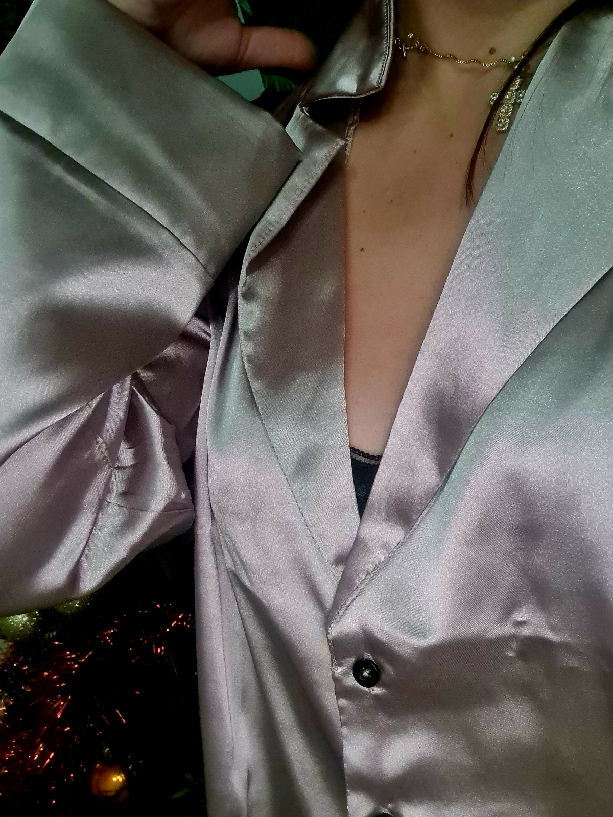 Sunt indragostita de aceasta pijama, este fina si comoda dar si foarte eleganta, nasturii sunt imbracati in acelasi material iar detaliul auriu este superb, urmeaza varianta pe alb, sunt incantata!